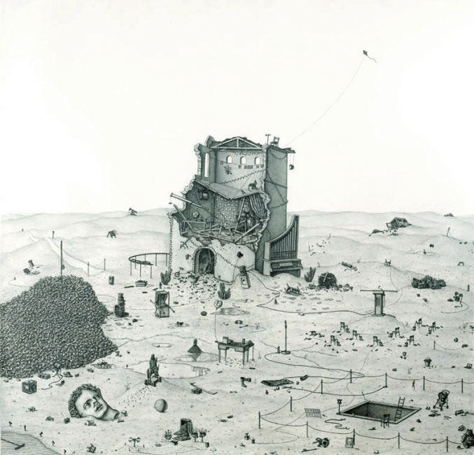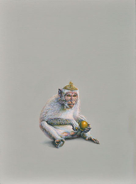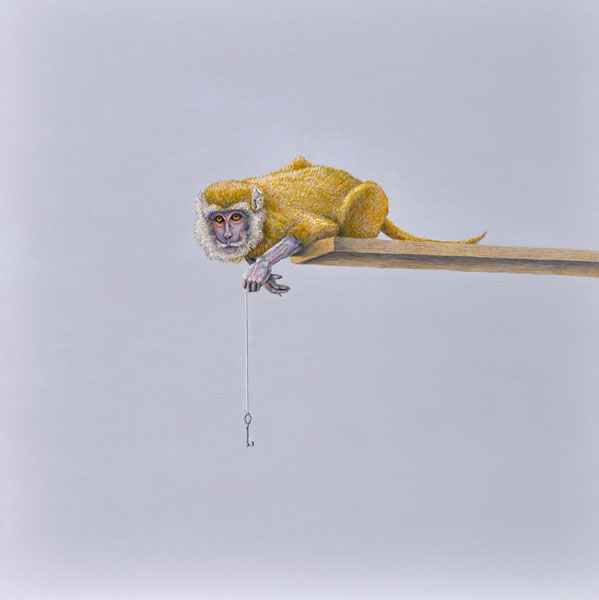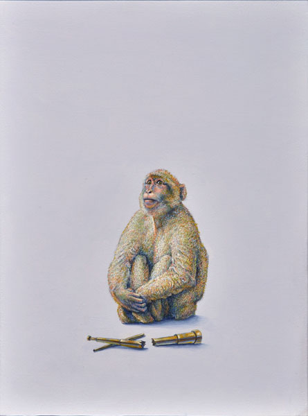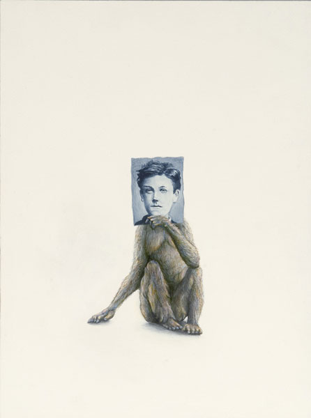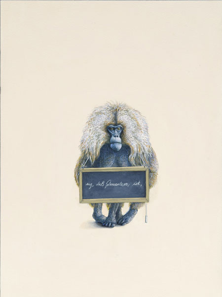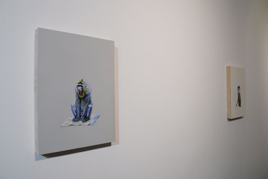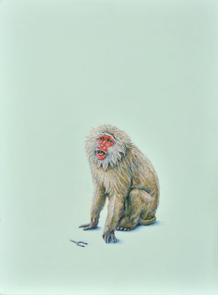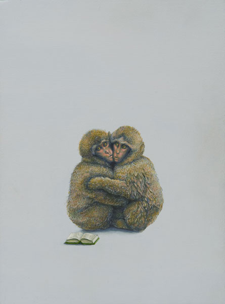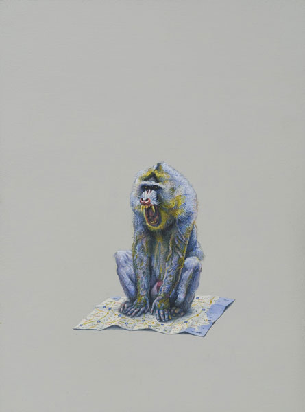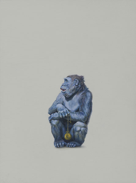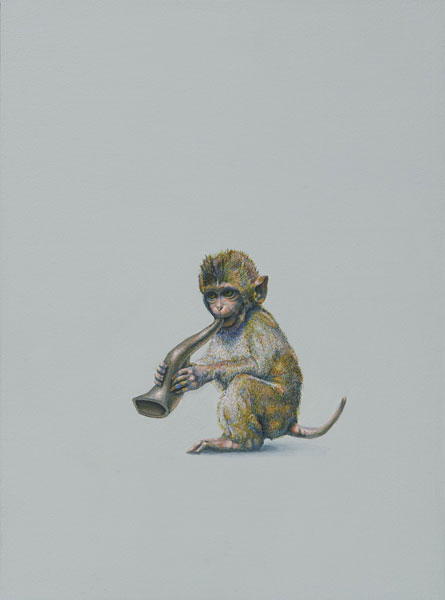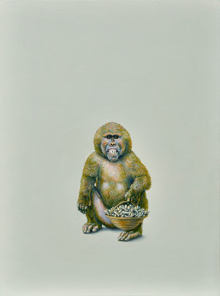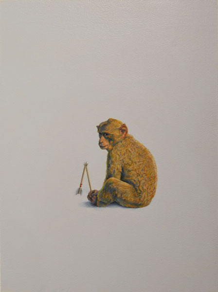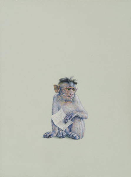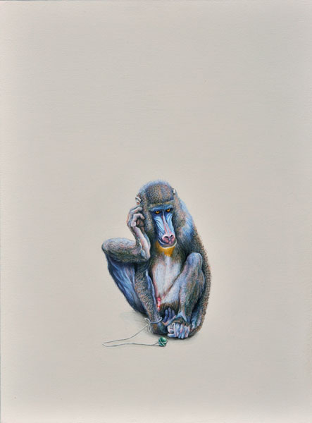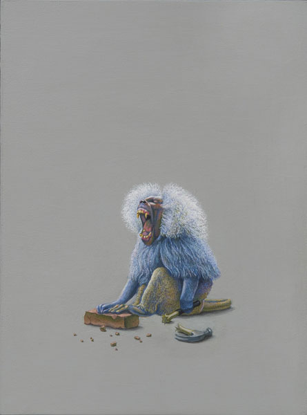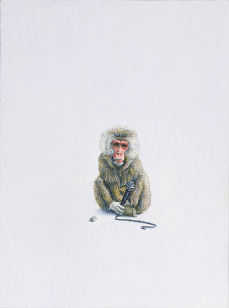 > The series of monkey paintings partly resulted from an interview with the late writer David Foster Wallace who was questioning the use and effects of emotion and sincerity as strategies in marketing culture. Explaining how the aloof irony generated against this practice is in fact tedious and absurd, the writer went on to voice the view that artists’ mission should lie in revealing the real mechanisms of human nature. Biel responded strongly to these words and began to give the monkeys inhabiting a drawing he was working on their individuality rather than having them belonging to a group. |