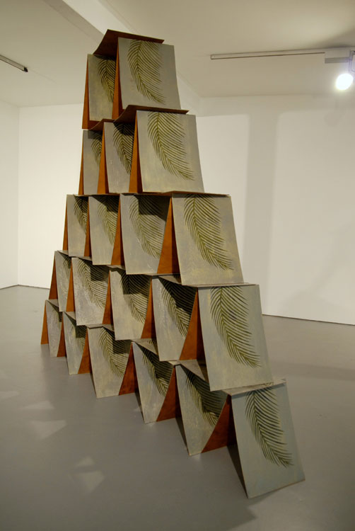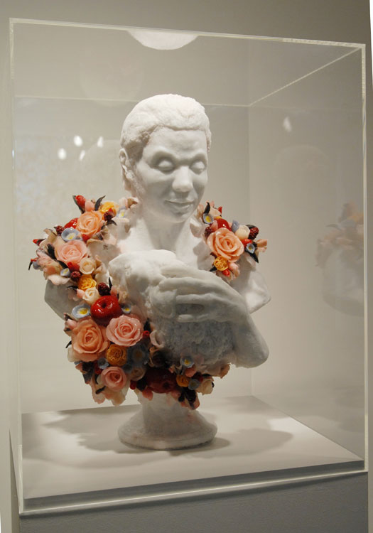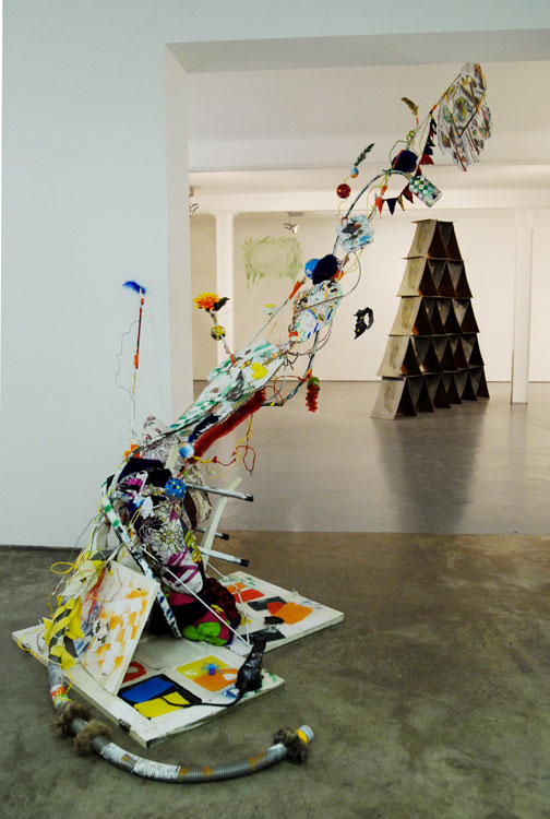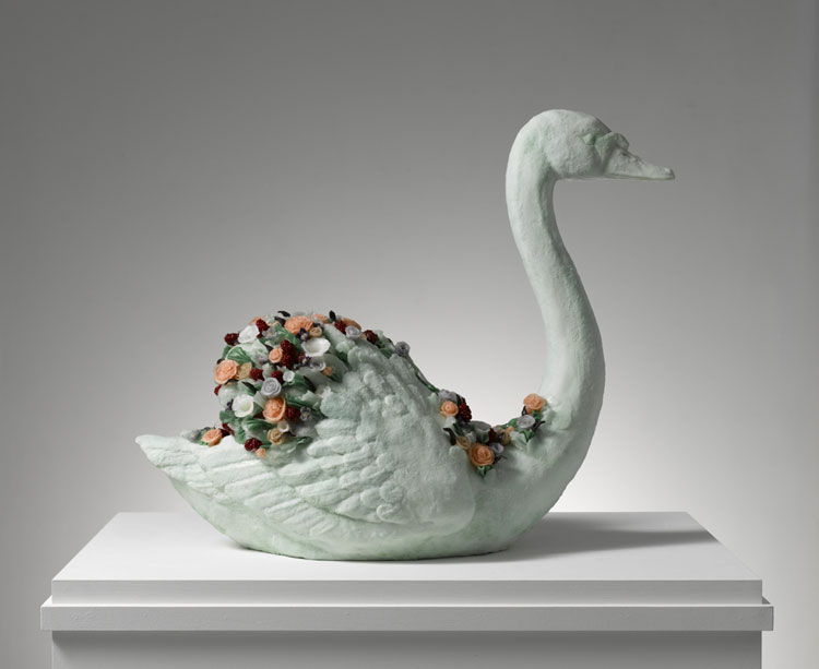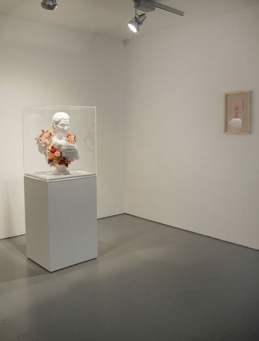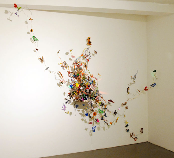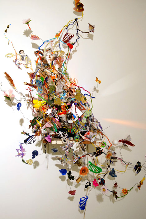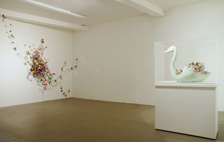 Adam King explains that his practice appropriates and reconfigures the detritus and stuff of urban consumerism in order to create assemblages and collage-compositions which reference the post-apocalyptic, pastoral, macabre and otherworldly. Re-using materials and objects collected from skips, thrift and charity shops alongside brand new products, these “exotic cosmologies” are extravagant panoramas conveying an ambiguous identity. Transformed and altered through the act of cutting, spray painting, mark making, decorating and sewing, King sees his works as “viral works growing and developing organically”. The artist is inspired by a wide range of sources including historical landscape painting, textile design, recent American collage, ethnography, curiosity cabinets and books and manuals relating to scientific discovery and the natural world. Exploring official forms of the baroque statuary and other conventional portraits “in memory of”, Rebecca Stevenson presents her sculptures as corrupted objects in a baroque spectacle. Endued with obsessive even fetishist decorative qualities, her works play incommensurably and with delight and enjoyment with ideas of supreme beauty and its inescapable grotesque aspect. The impulse to decorate is seen in her practice as an acting-out of desire that supplants the object's original form and meaning. Extending past the visual, sculptures engage on a visceral or sensual level, the sugary surfaces and succulent waxy fruits provoking the desire to taste or touch the work. The works are compelling in their ability to build desire from repulsion.