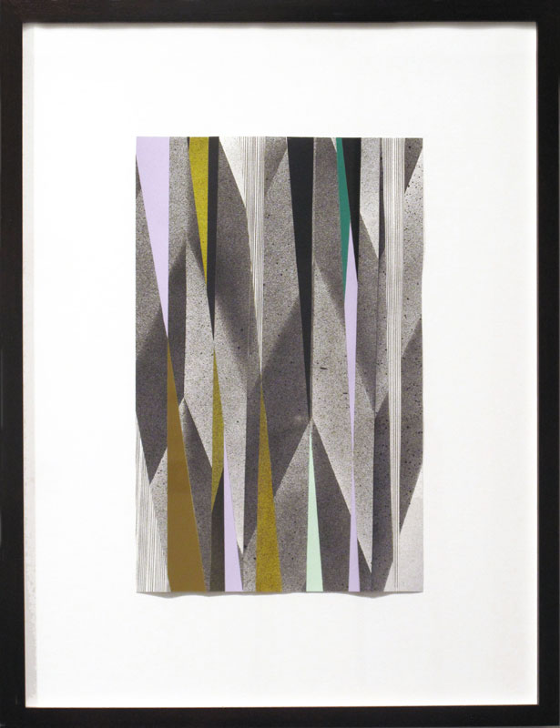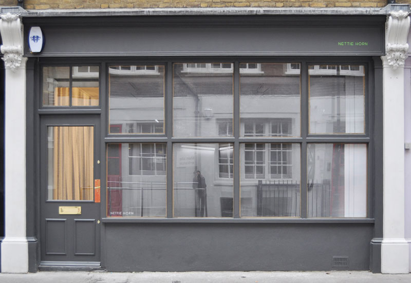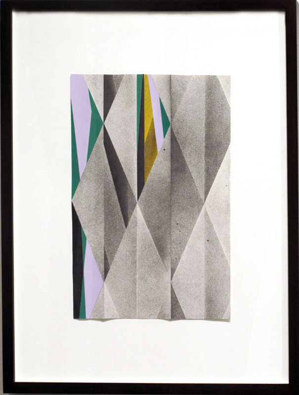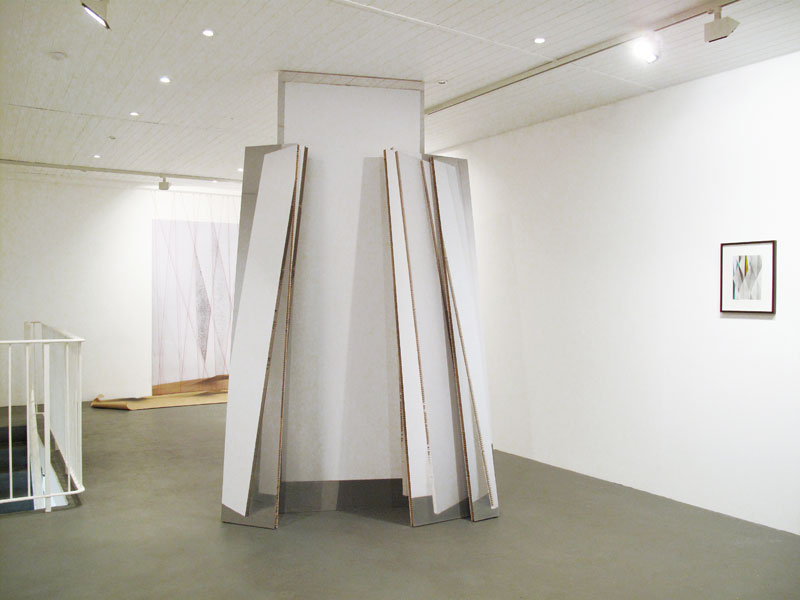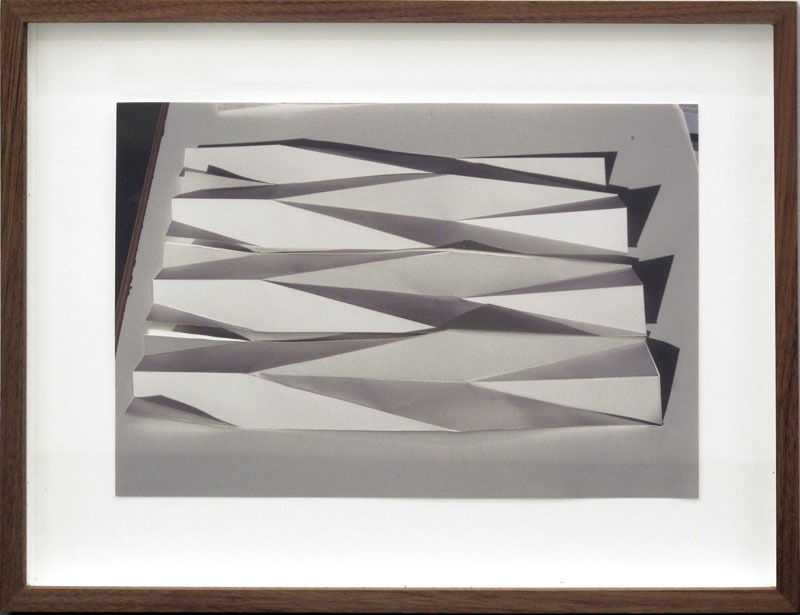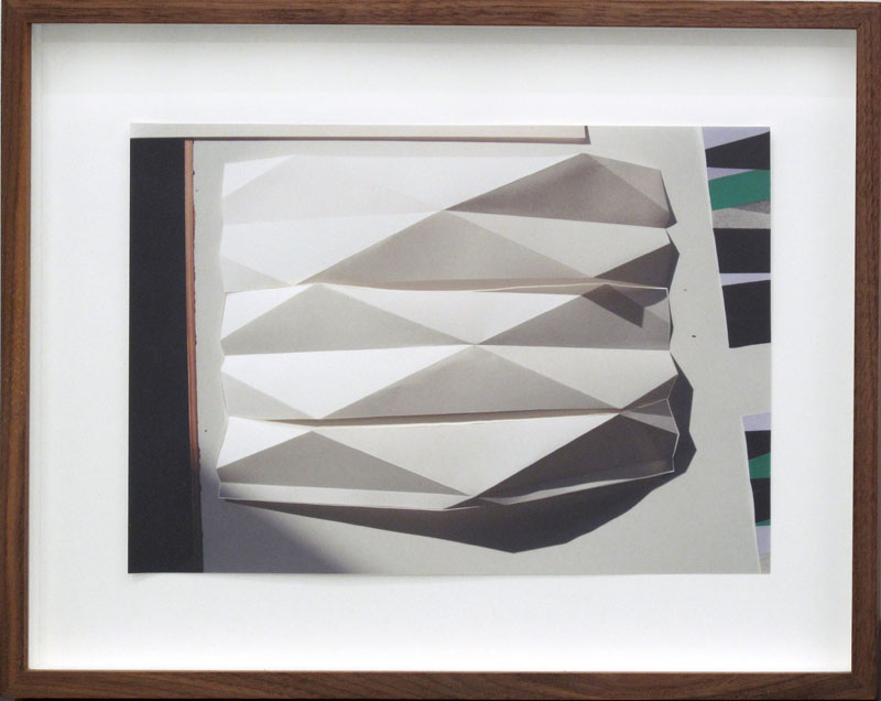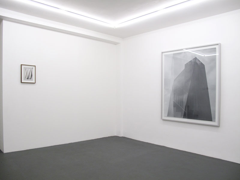 SINTA WERNER "Setting the Setting” NETTIE HORN is pleased to present a solo exhibition by German artist Sinta Werner, featuring a group of site-specific works consisting of sculptural and print-based elements, shown alongside a wall painting and collage series. This entire body of work is developed around the concept of folding and doubling - as a primal process of dimensional shift. Sinta Werner’s practice engages with the creation of experiences questioning the representation of space, predominantly through an exploration of the two and three-dimensional. From an initial focus on the materialisation of fictitious environments (as, for example, a mirrored or double-exposure space might represent it), to a recent exploration into the world of digital media and its virtual journey, Werner’s new body of work evolves from a reflection on the notion of representation itself. All the works have in common that the image-support is at the same time the image-subject. The central piece 'Setting the Setting / Staging the Fake' consists of honeycomb-cardboard panels, staged like improvised architectural walls not yet in their final position. This arrangement has then been photographed, printed and mounted back onto the panels, so that shifts of perspective are evoked, and so that the surrounding architecture - i.e. the panels and images of the panels and exhibition space - are interlaced. Conceptually this work can be seen in the tradition of Joseph Kosuth's famous piece 'One and Three Chairs', which consists of a chair, a photograph of it, and it's dictionary definition. Whilst Kosuth had been splitting up the object into its semiotic layers, Werner’s interest lies in the object being split up into its dimensions, yet still being contained within one piece; and in the fragmentation, dislocation and shift in perception involved in this process. The honeycomb-cardboard panels (as well as the frames in the slide-object shown in the basement) have been selected as subject matter for their neutrality, and for functioning as mere extensions of the exhibition space, or display. The site-specific photograph ‘Mise en Scène de la scène’ also suggests a situation - as if the installing of the show was still in process. Packing paper, which would normally protect the floor from paint, and string (which works as subsidiary lines for the wall painting), have become part of the piece - connecting a photograph of this display with its original elements. There is an aspect of fakery in this arrangement: whatever looks unfinished or arbitrary has in fact the theatrical aspect of a manipulated reality. This geometric pattern then reappears in the window piece and in the finished wall painting, themselves having their origins in the small collage works ‘Untitled (Folds Unfold)’. Here what appears like a 'mise-en-abyme' in the larger print, is finally a 'mise-en-abyme' running throughout the entire show. These collage works then close the circle of this theme of doubling, as they too are constructed from folded paper, which, simultaneously, also depict them. The series of collages 'Discrete Folding' take a similar approach. Here sheets of paper have been folded, photographed, printed and then refolded according to their original state. Werner's collages and installations are often developed through this process of transferring back and forth between two and three dimensions. Existing architecture is another source of inspiration in Werner’s practice, such as in the collage series ‘Schattenfassaden’. In this series the architecture of socialist warehouses from the 1960’s form the origin of this photographic series. With these Werner initially made replica cardboard models of the buildings facades, photographed them in strong sunlight to create high contrast shadows, then cut into these photographic prints in order to fold them back into the same structure as the "original' replica model. Existing architecture is also at the origins of ‘Scraping the Sky’ in which the materiality and gravity of the building is suspended. As the architectonic planes in the collage have been replaced by details of the sky, the reflective invisibility of the building is emphasised. The cut-out sections of sky feature as both construction and deconstruction, creating a geometrical space in which the sky appears separated from reality.