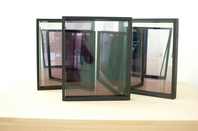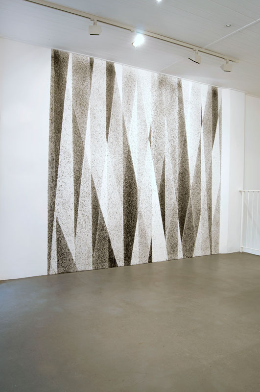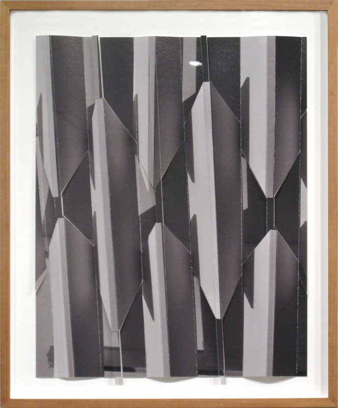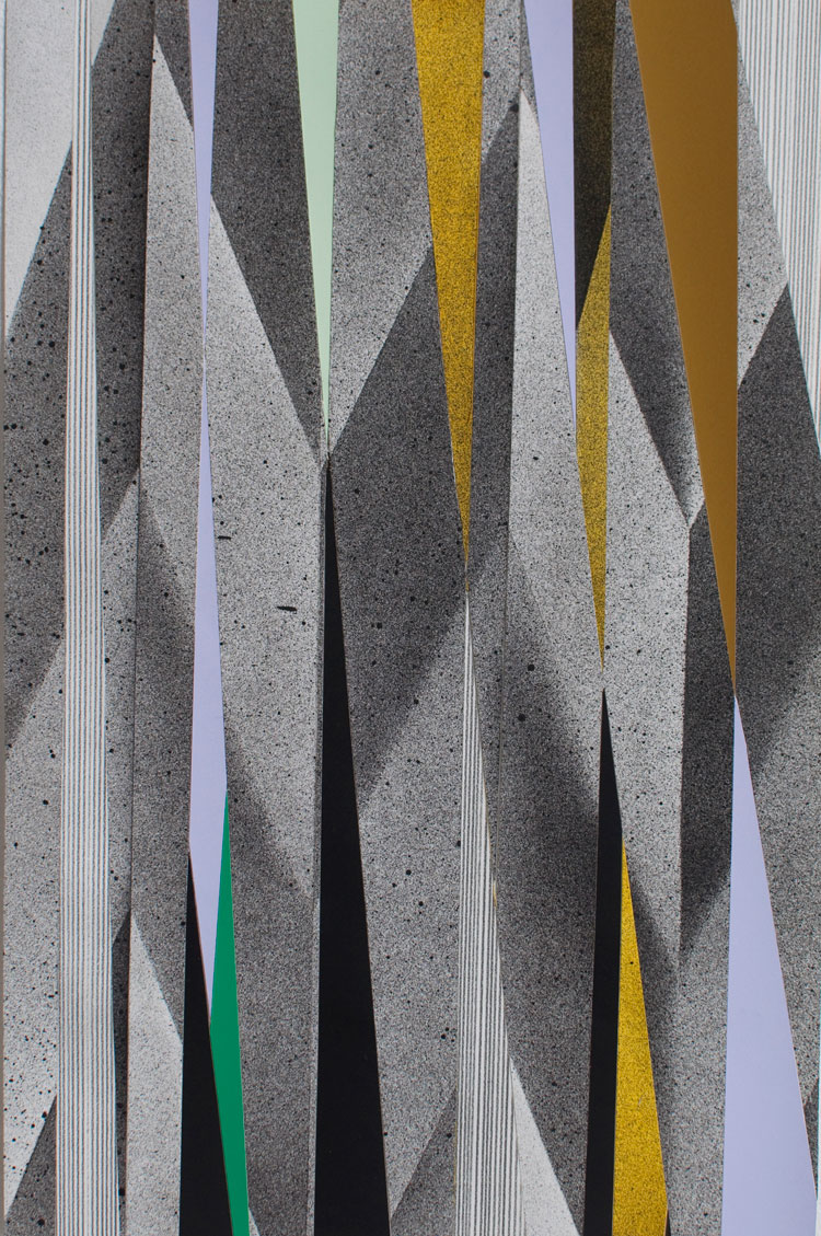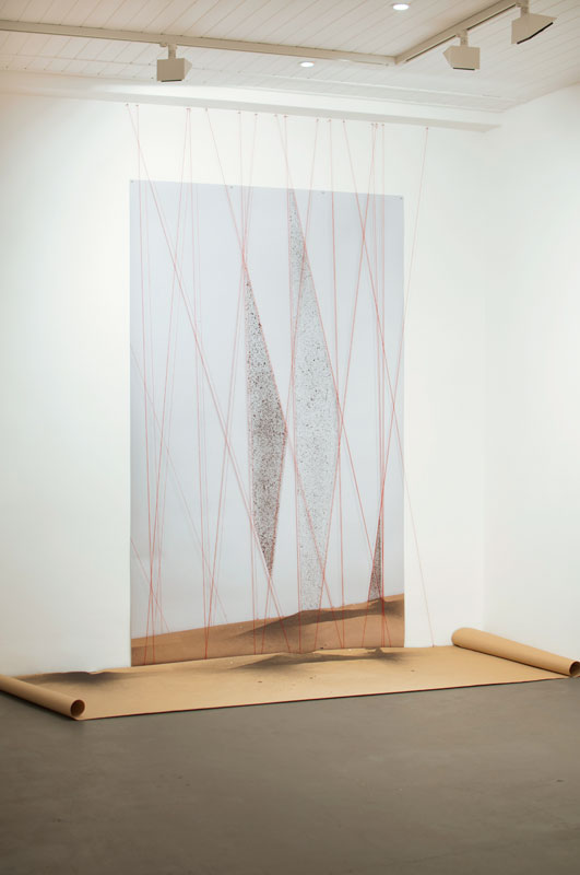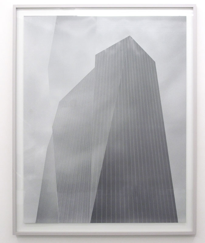 SINTA WERNER "Setting the Setting” NETTIE HORN is pleased to present a solo exhibition by German artist Sinta Werner, featuring a group of site-specific works consisting of sculptural and print-based elements, shown alongside a wall painting and collage series. This entire body of work is developed around the concept of folding and doubling - as a primal process of dimensional shift. Sinta Werner’s practice engages with the creation of experiences questioning the representation of space, predominantly through an exploration of the two and three-dimensional. From an initial focus on the materialisation of fictitious environments (as, for example, a mirrored or double-exposure space might represent it), to a recent exploration into the world of digital media and its virtual journey, Werner’s new body of work evolves from a reflection on the notion of representation itself. All the works have in common that the image-support is at the same time the image-subject. The central piece 'Setting the Setting / Staging the Fake' consists of honeycomb-cardboard panels, staged like improvised architectural walls not yet in their final position. This arrangement has then been photographed, printed and mounted back onto the panels, so that shifts of perspective are evoked, and so that the surrounding architecture - i.e. the panels and images of the panels and exhibition space - are interlaced. Conceptually this work can be seen in the tradition of Joseph Kosuth's famous piece 'One and Three Chairs', which consists of a chair, a photograph of it, and it's dictionary definition. Whilst Kosuth had been splitting up the object into its semiotic layers, Werner’s interest lies in the object being split up into its dimensions, yet still being contained within one piece; and in the fragmentation, dislocation and shift in perception involved in this process. The honeycomb-cardboard panels (as well as the frames in the slide-object shown in the basement) have been selected as subject matter for their neutrality, and for functioning as mere extensions of the exhibition space, or display. The site-specific photograph ‘Mise en Scène de la scène’ also suggests a situation - as if the installing of the show was still in process. Packing paper, which would normally protect the floor from paint, and string (which works as subsidiary lines for the wall painting), have become part of the piece - connecting a photograph of this display with its original elements. There is an aspect of fakery in this arrangement: whatever looks unfinished or arbitrary has in fact the theatrical aspect of a manipulated reality. This geometric pattern then reappears in the window piece and in the finished wall painting, themselves having their origins in the small collage works ‘Untitled (Folds Unfold)’. Here what appears like a 'mise-en-abyme' in the larger print, is finally a 'mise-en-abyme' running throughout the entire show. These collage works then close the circle of this theme of doubling, as they too are constructed from folded paper, which, simultaneously, also depict them. The series of collages 'Discrete Folding' take a similar approach. Here sheets of paper have been folded, photographed, printed and then refolded according to their original state. Werner's collages and installations are often developed through this process of transferring back and forth between two and three dimensions. Existing architecture is another source of inspiration in Werner’s practice, such as in the collage series ‘Schattenfassaden’. In this series the architecture of socialist warehouses from the 1960’s form the origin of this photographic series. With these Werner initially made replica cardboard models of the buildings facades, photographed them in strong sunlight to create high contrast shadows, then cut into these photographic prints in order to fold them back into the same structure as the "original' replica model. Existing architecture is also at the origins of ‘Scraping the Sky’ in which the materiality and gravity of the building is suspended. As the architectonic planes in the collage have been replaced by details of the sky, the reflective invisibility of the building is emphasised. The cut-out sections of sky feature as both construction and deconstruction, creating a geometrical space in which the sky appears separated from reality.