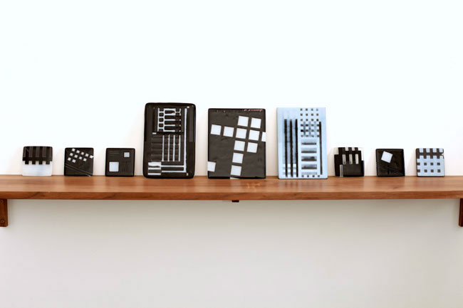 Samson ’s series of glass pictures entitled For a future observation of the dark matter stems from her discovery of the graphic simulations generated by a spectroscope during her time at the laboratory of astronomy in Marseille. This machine, which is still in production, may one day detect the existence of dark matter - a non luminous and invisible matter which is hypothetically present in large quantities in the Universe. Recalling universal grid systems, these stratified glass pictures, formed through a firing process, invite us to decipher an enigmatic vocabulary leading us to consecutively explore languages from optical astronomy to geometric abstraction. Inspired by Joseph Albers’ glass pictures made in the 1920’s at the Bauhaus, Samson pays tribute to this artist in Last trip to Chichén Itzá and Uxmal and Albers Uxmal. After his move to the American continent in 1933, Albers introduced references to Mexican architecture in his photographic practice and notably to the geometric bas-reliefs of the Mayan temples which Samson refers to in these archaeological style tablets. The nine aligned glass pictures from Albers Uxmal - essentially inspired by the architectural grid system – are presented on a wooden shelf made from American black walnut, another nod to Albers' country of adoption.