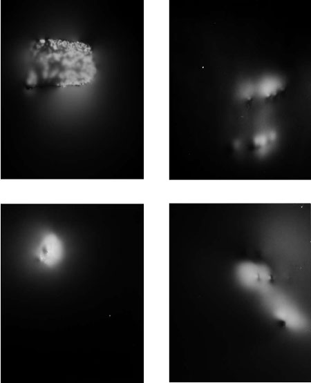 Here a series of big black and white film photographs overlooking an outsized workbench represent the outcome of a home-made scientific experiment: artist Bettina Samson has set out to recreate the chance situation leading Henri Becquerel’s discovery of radioactivity in 1896, when he found that uranium left an imprint on photographic plates without the need for any light input. Working in total darkness, Samson exposed sheet film to the radiation of pitchblende, a form of uranium ore, and obtained near-immaterial images which, enlarged, suggest some kind of astronomical phenomenon. Can photos be made without visible light? This process recalls the pioneering use of silver-salts photography as a scientific tool and the way the resultant images were later echoed in abstract painting. Chance and error are both dynamic principles within scientific and artistic research, sharing as they do the same experimental dimension. In the middle of the room there stands, like a monumental tribute to “decisive fortuity”, a stylised marquetry transposition of the scientist’s oak workbench, a near relative of the tradesman’s. Our reading of the work, however, is disturbed by the presence of a translucent yellow plaque with silver letters etched into it, a transcription of the 1939 letter from Albert Einstein to Franklin Roosevelt that triggered the Manhattan Project for an atomic bomb. This ellipsis between two past events highlights the provisional character of our certainties as a factor that renders the notion of scientific progress distinctly problematic. Text by Pedro Morais in Bettina Samson, Laps & Strats, edition Adera, Lyon, 2009.