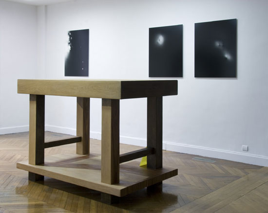 Here a series of big black and white film photographs overlooking an outsized workbench represent the outcome of a home-made scientific experiment: artist Bettina Samson has set out to recreate the chance situation leading Henri Becquerel’s discovery of radioactivity in 1896, when he found that uranium left an imprint on photographic plates without the need for any light input. Working in total darkness, Samson exposed sheet film to the radiation of pitchblende, a form of uranium ore, and obtained near-immaterial images which, enlarged, suggest some kind of astronomical phenomenon. Can photos be made without visible light? This process recalls the pioneering use of silver-salts photography as a scientific tool and the way the resultant images were later echoed in abstract painting. Chance and error are both dynamic principles within scientific and artistic research, sharing as they do the same experimental dimension. In the middle of the room there stands, like a monumental tribute to “decisive fortuity”, a stylised marquetry transposition of the scientist’s oak workbench, a near relative of the tradesman’s. Our reading of the work, however, is disturbed by the presence of a translucent yellow plaque with silver letters etched into it, a transcription of the 1939 letter from Albert Einstein to Franklin Roosevelt that triggered the Manhattan Project for an atomic bomb. This ellipsis between two past events highlights the provisional character of our certainties as a factor that renders the notion of scientific progress distinctly problematic.