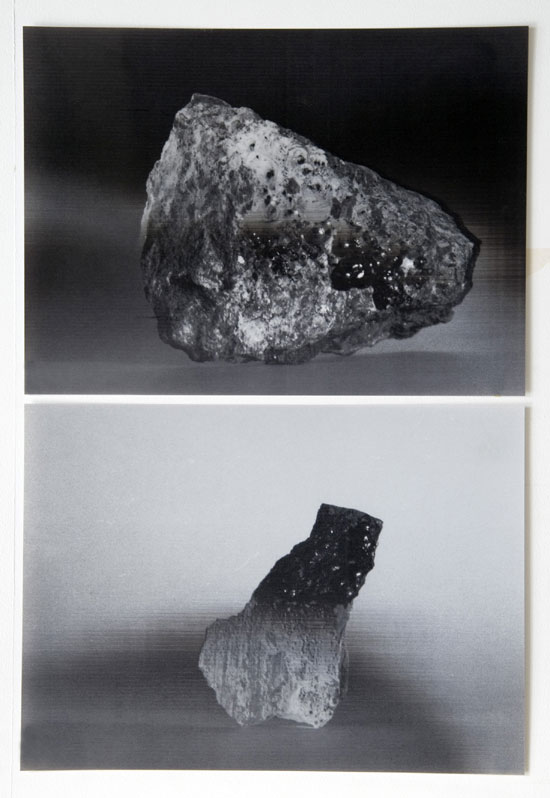 Pitchblende was used by Marie Curie as a means of determining the origin of the radiation accidentally discovered by Henri Becquerel in 1896. In addition to experimenting with this form of uranium ore in the photographic series How, by chance, Henri Becquerel discovered radioactivity and Nuclear Dust, as well as in the video Exhibitions/Exposures: 5 times 3’30”, Bettina Samson has also put it to scientific uses in the two photographs Pitchblende Portrait #1 and #2. Here the portrait genre specified in the title provides individual, formal Characterisations of each mineral specimen, and in so doing subversively anthropomorphises them. Presented as a negative – black on a white background – this image reverses the mineral’s irradiation effect, which on film produces white spots on a black background. However the notion of image-reversal is counterbalanced by the illusion of relief provided by a lenticular poster. Charged with a new optical effect, the object seems to take on another dimension and produce a special kind of after-image. Immortalised in these portraits, it is summoned up again by memory and, with the “special effects” that have given in its place in the history of science, handed on to posterity. Text by Anne-Lou Vicente in “Bettina Samson”, La Galerie, Centre d’Art Contemporain, Noisy-le-Sec (exhibition 5 December 2009 – 13 February 2010). Photography: Cedrick Eymenier.