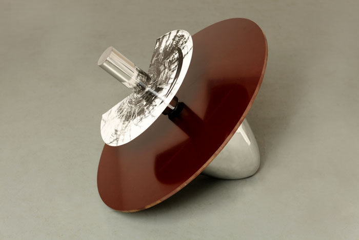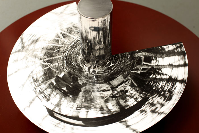 The unorthodox spinning-top entitled Levitation incarnates this communion between diverse entities and dimensions. Using the cone of a plane propeller as the base of the sculpture, this apocryphal object seems to instigate a path linking the earth with the sky, and this despite its current immobility. A closer look at the object reveals the vestige of a previous spin where the spinning-top displays an intriguing black and white anamorphic image. Sourced from a Russian book on Siberian shamanism, this photograph taken in the early 1900’s represents a couple from the Evenk people posing in a forest and in front of an enigmatic and levitating long black shape (which is in fact an aerial coffin) mysteriously suspended from the tree heights... Informed by traditions and beliefs, Samson’s interest lies in the transitional process between one world and another which she addresses by smoothly playing with notions of anachronism and parallelism.