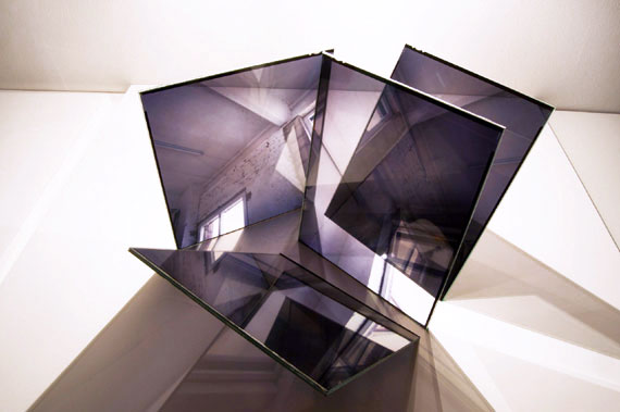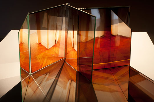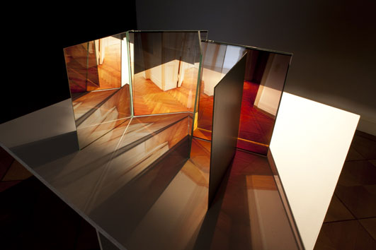 A mirroring effect is generated through the positioning of actual mirrors within the work, which is intensified not only by the mirrored projection produced by the slide itself but also by the doubling of the slides and the effect of inverted-mirroring. These "slide-objects" function similarly to a kaleidoscope: the unusual viewing point of the shots of the interior spaces, the asymmetricality of the angles and positioning of the slides as well as the distortion of the projected image create an impression of fragmentation and instability.