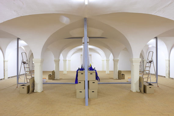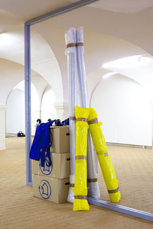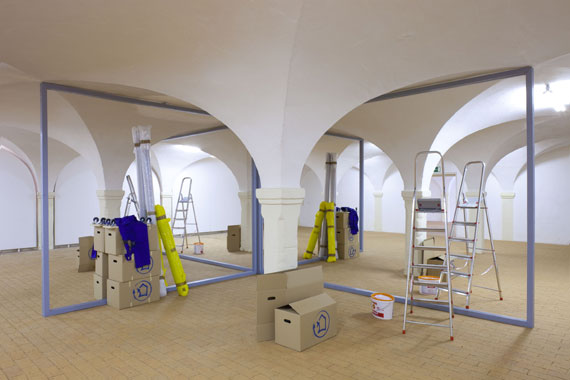 ![]() 4 x Doublefixed / Classic Aluminium, 2009 Wood, paint, 4 ladders, 20 cardboard boxes,4 buckets of wall paint Installation view, Kunstverein Aichach