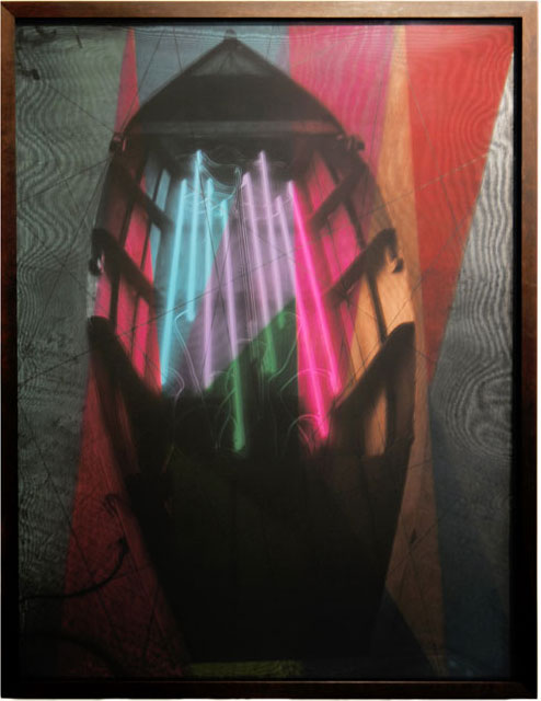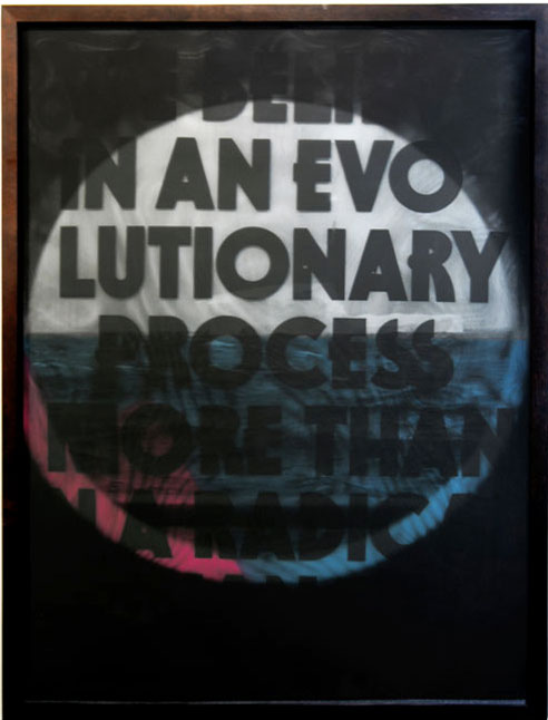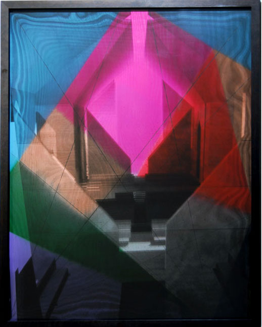 Offset print film, paper tape, spray paint on plywood, graphite, frame
